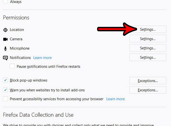 Bu adımların resimleri de dahil olmak üzere, Firefox'un her zaman konumu her zaman engellemesini nasıl sağlayacağına dair genişletilmiş adımlar için aşağıda devam edebilirsiniz.
