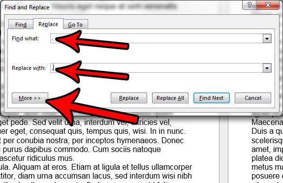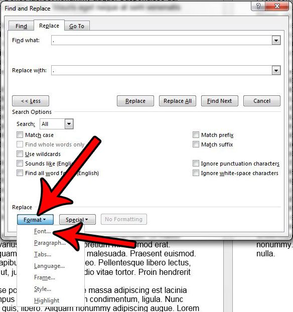 Adım 4: A Dönemi yazınNe bulalan, bir dönem yazınDeğiştirmekField (fare imleciniziDeğiştirmekAlan, aşağıda ayarladığımız yazı tipi boyutu, imleçin hangi alana göre ayarlanacağı gibi), ardındanDahaPencerenin sol alt kısmındaki düğme.