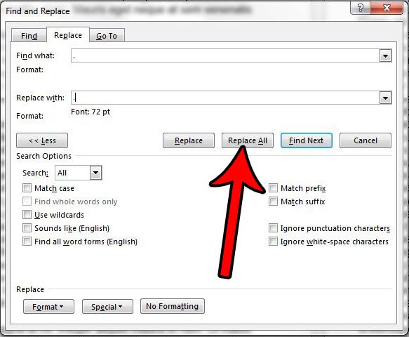 Adım 7: tıklayınHepsini değiştirBelgenizdeki tüm dönemleri daha büyük hale getirme işlemini tamamlamak için düğme.