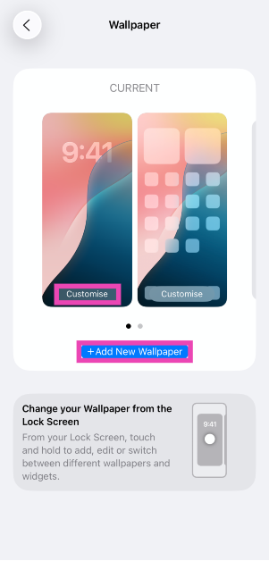 2. Adım:VurmakÖzelleştirmekMevcut kilit ekranı duvar kağıdınızda değişiklik yapmak için. DenemekYeni Duvar Kağıdı EkleYeni bir kilit ekranı oluşturmak için.