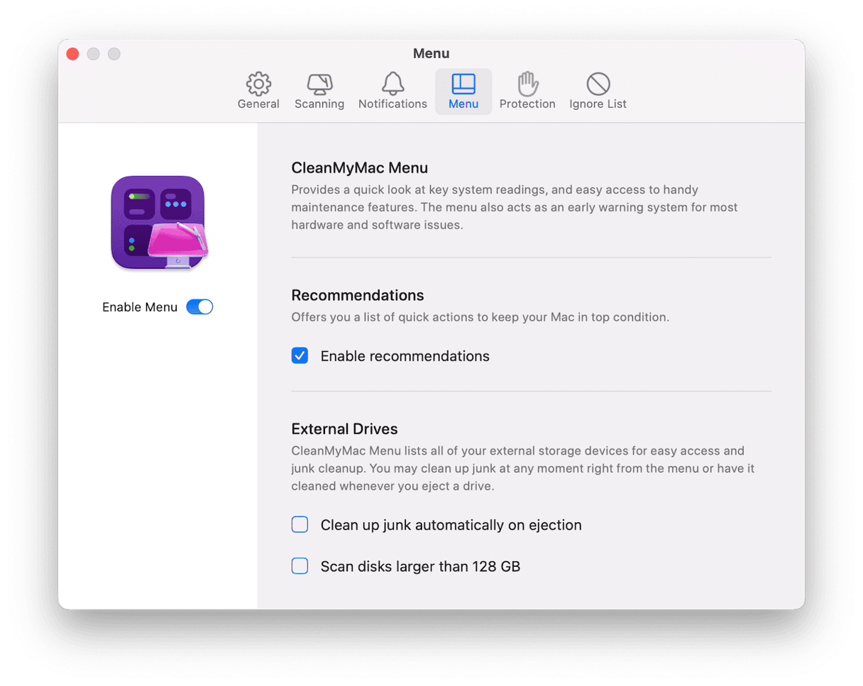 Herhangi bir nedenle, IMAC simgesini menü çubuğunda göremezseniz, CleanMyMac'ı açın ve etkinleştirmek için Ayarlar> Menü'ye gidin.