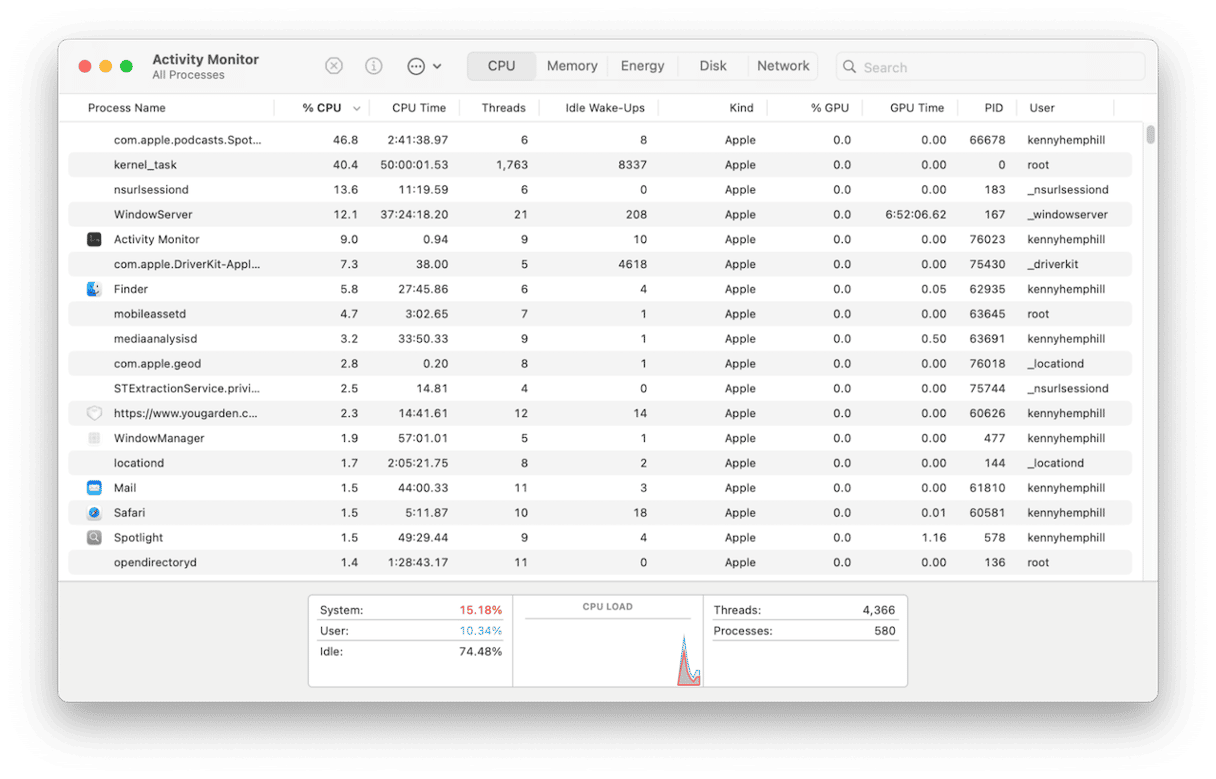 Etkinlik Monitörü harika bir kaynaktır. Size hangi süreçlerin sistem kaynaklarını kandırdığını hızlı bir şekilde söyleyebilir. Kaynakların adil payından daha fazlasını kullanan herhangi bir sürecin, laggy bir MacBook'un nedeni olması muhtemeldir.