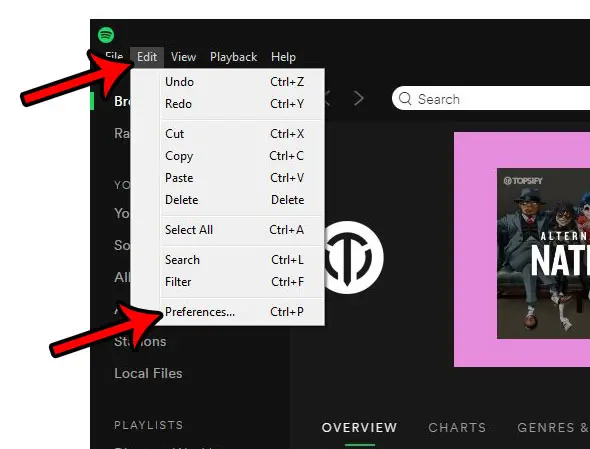 2. Adım: tıklayınDüzenlemekPencerenin sol üst köşesindeki bağlantı yapın, ardındanTercihlerseçenek.