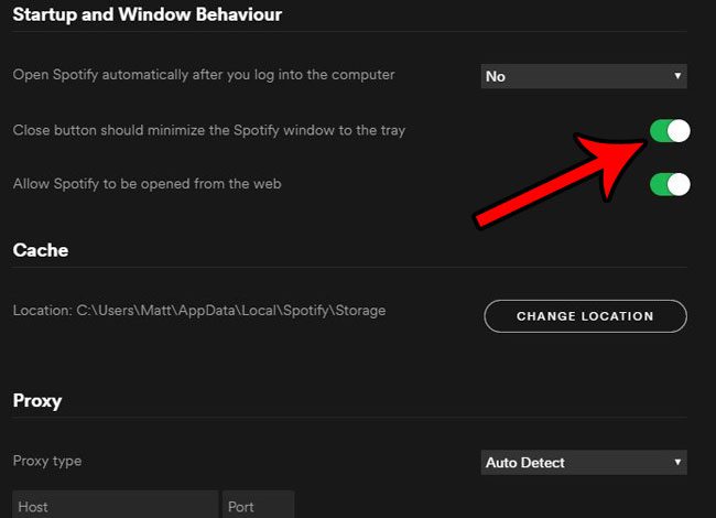 4. Adım: Aşağı kaydırın ve sağdaki düğmeyi tıklayınKapat düğmesi, spotify penceresini tepsiye en aza indirmelidir. Ayarı etkinleştirdiğinizde düğmenin etrafında yeşil gölgeleme olmalıdır. Aşağıdaki resimde etkinleştirilir.