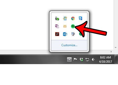 Tepsiye en aza indirdikten sonra Spotify'ı yeniden açmak istiyorsanız, Spotify simgesini oraya çift tıklayabilirsiniz. Başlangıçta görüntülenemeyebilecek ek simgeleri genişletmek için tepsideki küçük oku tıklamanız gerekebileceğini unutmayın.