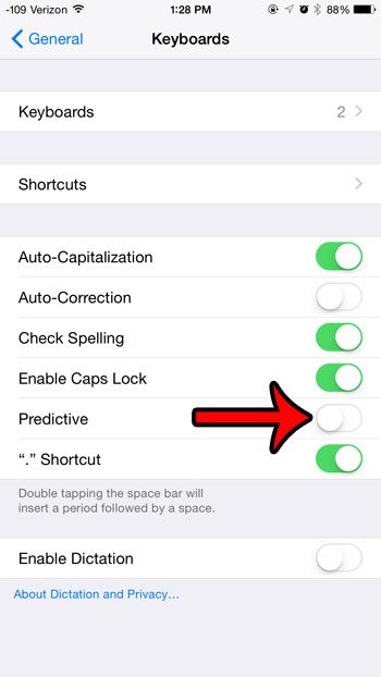 Öngörücü metin çubuğunu tamamen gizlemek istiyorsanız, bunu yapabilirsiniz.Ayarlar> Genel> KlavyeVe kapatmakÖngörücüseçenek.