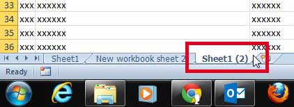 Çalışma sayfalarımı yeniden adlandırmadığımı not edeceksinizSac 1, ancak Excel, aşağıdaki resimde olduğu gibi, sayfa adının sonuna parantez içinde bir sayı ekleyerek yinelenen sayfa adlarını işler.