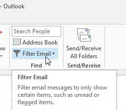 3. Adım: tıklayınFiltre e -postasıiçindeki düğmeBulmakPencerenin üst kısmındaki şeridin bölümü.