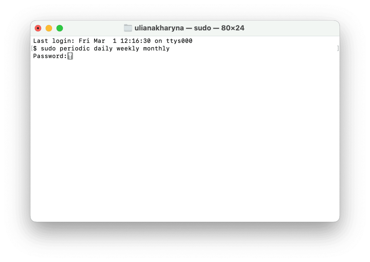 sudo periodic daily weekly monthlyve dönüş tuşuna basın. - Yönetici şifrenizi girmeniz istenecektir. Güvenlik nedeniyle, şifreniz ekranda görünmez.