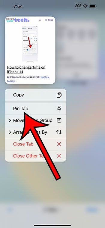 Safari'yi açarak, Sekme Simgesini seçerek, sabitlemeyi bulanıp tutup tutarak bir iPhone 14'teki Safari'de bir sekmeyi sabitleyebilirsiniz. Sonra seçebilirsinizPin sekmesiseçenek.