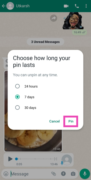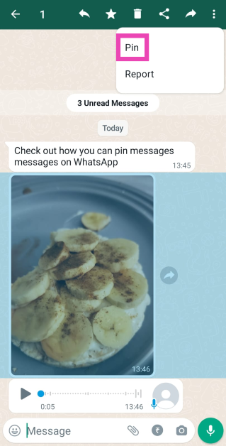 WhatsApp, bir sohbette en fazla 3 mesaj sabitlemenize olanak tanır. Bu metinleri, görüntüleri, bağlantıları, sesli notaları ve anketleri içerebilir.