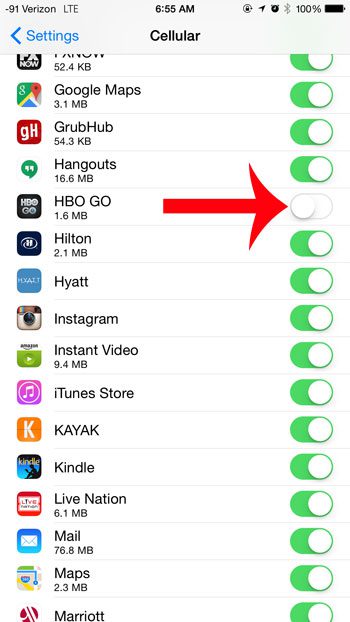 Adım 3: Aşağı kaydırın ve sağındaki düğmeye dokununHBO GİT. Aşağıdaki resimde olduğu gibi, düğmenin etrafında yeşil gölgeleme olmadığında HBO GO'nun Wi-Fi ile sınırlı olduğunu bileceksiniz.