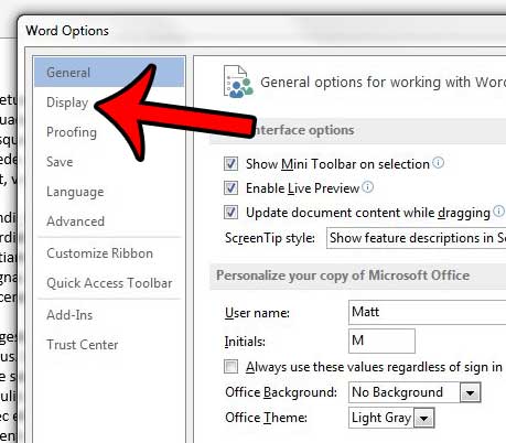 4. Adım: tıklayınGörüntülemekSekme sol tarafındaKelime Seçenekleripencere.
