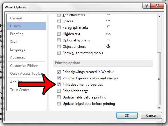 Adım 5: aşağı doğru kaydırınBaskı seçenekleriMenünün bölümü, solundaki kutuyu kontrol edin.Baskı Belge Özelliklerisonra tıklayınTAMAMPencerenin altındaki düğme.