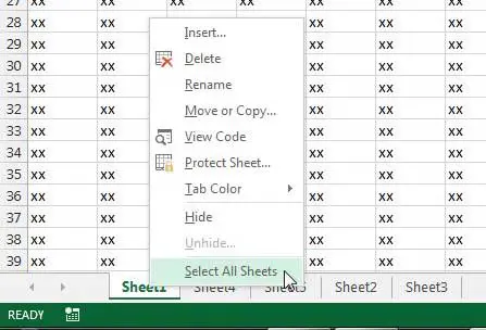 2. Adım: Ekranın altındaki sayfa sekmelerinden birini sağ tıklayın, ardındanTüm çarşafları seçinseçenek.