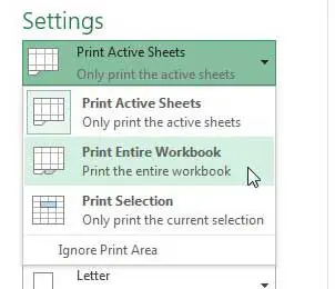 Tüm çalışma sayfalarınız yine de seçilmeli ve bu nedenle etkin olduğundan,BasılıTüm etkin tabakaları yazdırmak için düğme. Ancak, tüm çalışma sayfaları hala seçilmezse,Etkin sayfaları yazdırındüğme ve tıklayınTüm çalışma kitabını yazdırınseçenek.