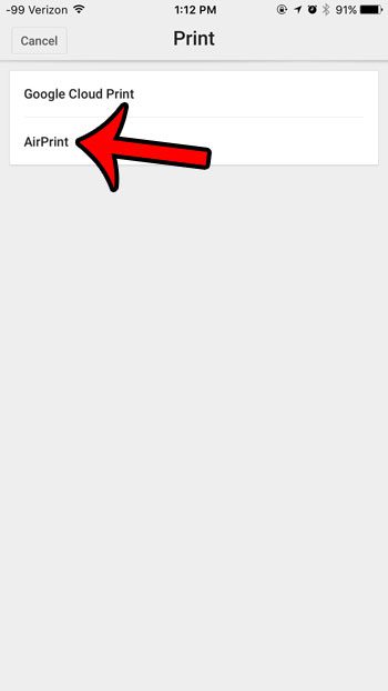 Adım 5: seçinHava iziWi-Fi ağınızdaki bir yazıcıya yazdırma seçeneği veyaGoogle Bulut BaskıGoogle hesabınızda oturum açtığınız başka bir bilgisayara yazdırmak için Google Cloud Print'i kullanmak istiyorsanız seçenek. Aşağıda bir Airprint yazıcısına baskı yaparak ilerleyeceğiz.