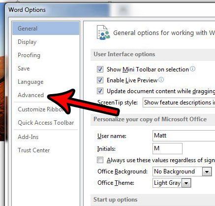 3. Adım: tıklayınGelişmişSekme Sol sütunundakiKelime Seçenekleripencere.