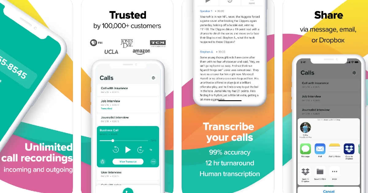 Rev Call Recorder ayrıca çağrı kayıtlarınız için insan transkripsiyonları sunar. Transkripsiyon AI değil bir insan tarafından yapıldığından, hataya neredeyse yer yoktur. Bu ücretsiz bir özellik değildir ve kullanıcılar dakikada ses başına ücret alır. Bu uygulamayı kullanmanın tek dezavantajı, kayıt düğmesine basar vurmaz bir kayıt duyurusu oynamasıdır. Aramaları kaydetmek için daha göze çarpmayan bir yöntem istiyorsanız, bir sonraki yönteme göz atın.