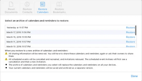 2. Adım:“Ayarlar” a basın, “Gelişmiş” seçeneğini tıklayın ve “Takvimleri ve Hatırlatıcıları Geri Yükle” yi seçin.