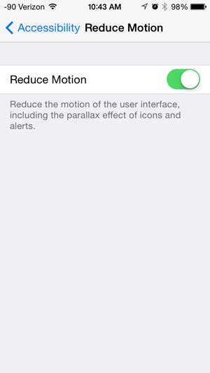 Bu özellik açıldığında bazı karışıklıklar olabilir, bu nedenle aşağıdaki son adımda görüntüyü not edin. Hareket azaltmayı etkinleştirdiğinizde (ve böylece daha az pil ömrü kullandığınızda) hareketin sağındaki düğme yeşil olacaktır.