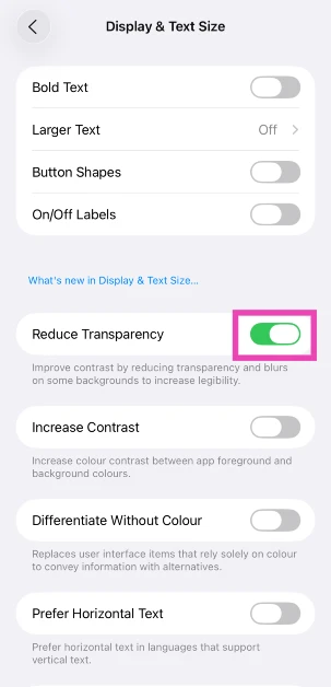 Gidip gelmekAyarlar> Erişilebilirlik> Ekran ve Metin Boyutuve 'şeffaflığı azaltın' yanındaki geçiş anahtarını açın.