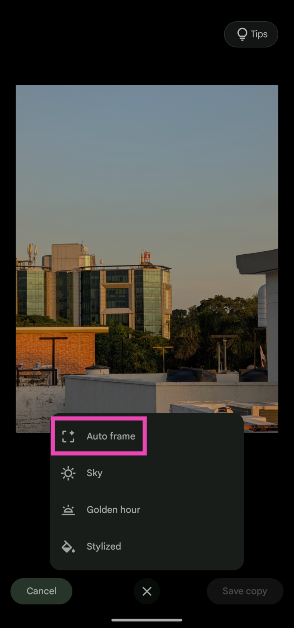 Otomatik çerçeve aracı, Magic Editor'da kalıcı bir öneri olarak görünür. Bu aracı çok çeşitli görüntülerde kullandık ve doğruluğu ve kompozisyon becerilerinden etkilendik. Konunun konumlandırılmasının biraz kapalı olduğu görüntülerde, otomatik çerçeve aracı uzaklaştırır ve daha iyi bir noktada yeniden düzenler. Yakınlaştırmanın bir sonucu olarak oluşturulan yeni alan, üretken AI tarafından doldurulur. Sihirli editör görüntüyü inceler ve ona uyan bir arka plan oluşturur. Otomatik çerçeve aracının portre oryantasyonunda yakınlaştırılmış bir resmi ne kadar iyi ayarladığına ve yeni ayrıntıların çok yapay görünmesini sağlamadan bir manzara çekimine dönüştürdüğüne özellikle şaşırdık.