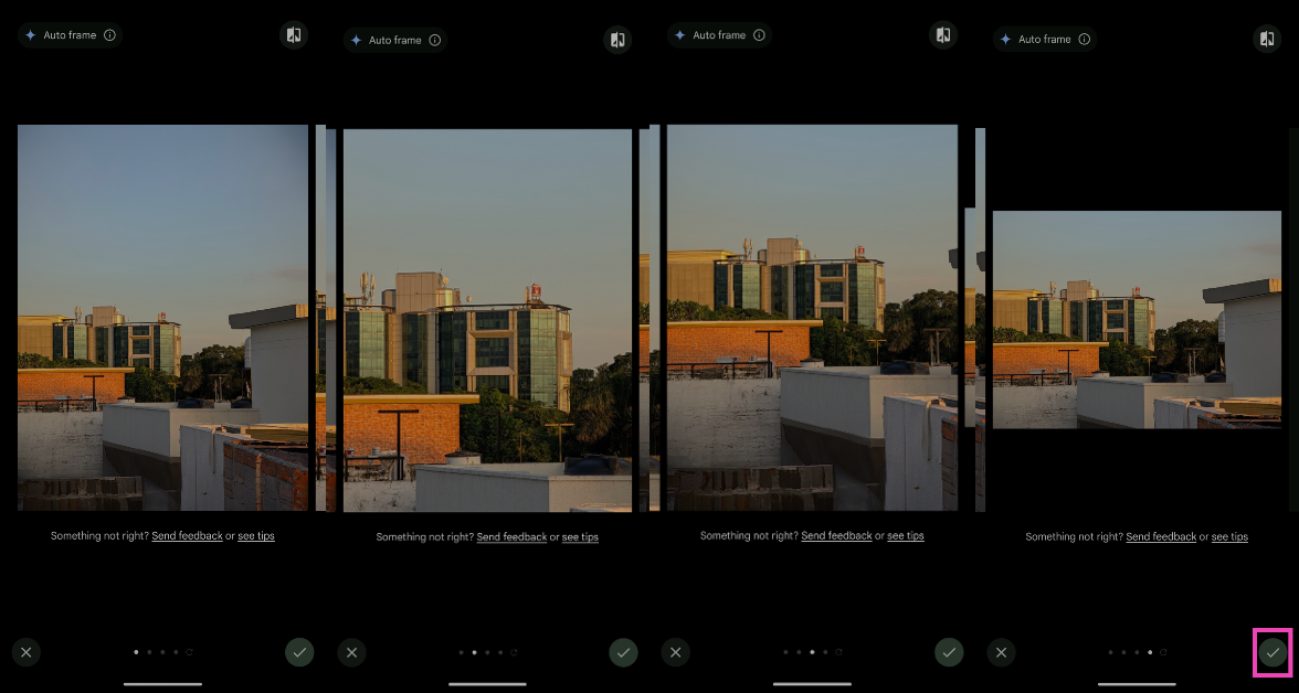 Otomatik Çerçeve Aracı Magic Editor'un bir parçasıdır. Erişmek için Fotoğraflar uygulamasında bir resim açın, 'Düzenle' tuşuna basın, ekranın sol alt köşesindeki Magic Editor simgesine dokunun ve alttaki öneriler simgesine basın.
