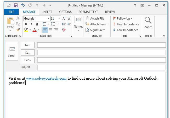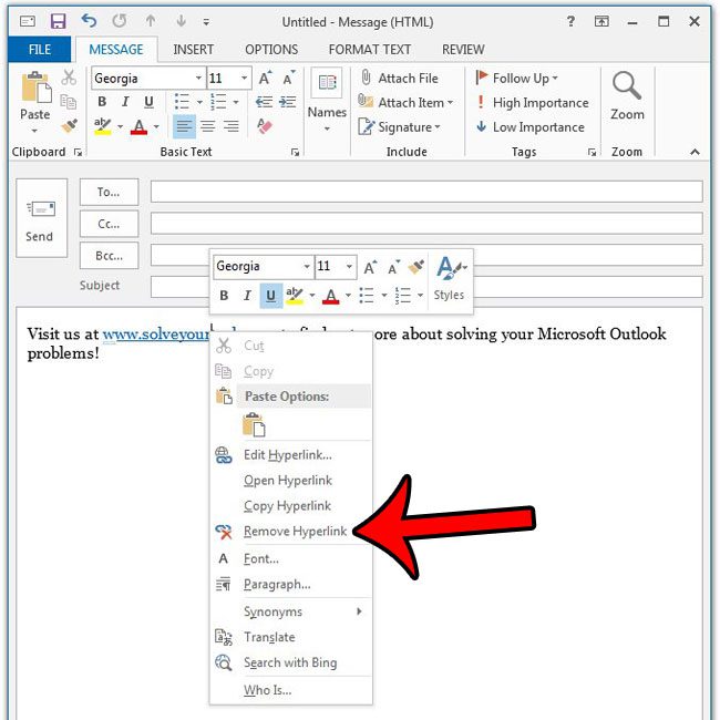 Bu makaledeki adımlar, bir e -posta mesajında Outlook 2013'te yazdığınız ve bu bağlantıyı kaldırmak istediğinizi tıklanabilir bir köprü olduğunu varsayacaktır.