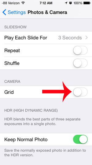Neyse ki, bu istediği gibi açılabilen veya kapatılabilen bir ayardır, bu nedenle iPhone 5'inizdeki kamera ekranından satırları kaldırmak mümkündür. Aşağıdaki kısa kılavuzumuz, bu ayarı cihazınızda nasıl bulacağınızı ve kapatacağınızı gösterecektir.
