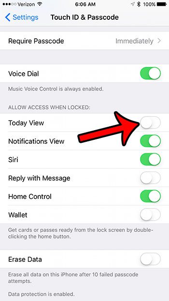 4. Adım: aşağı doğru kaydırınKilitlendiğinde erişime izin verinBölüm, ardından sağındaki düğmeye dokununBugün Görünümkapatmak için. Düğme sol pozisyonda olmalı ve ayar devre dışı bırakıldığında herhangi bir yeşil gölgeleme içermelidir. Aşağıdaki resimde kapattım.