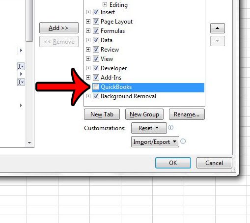 Adım 5: Soldaki kutuyu tıklayınQuickBooksonay işaretini kaldırmak için pencerenin sağ tarafındaki sütunda. Sonra tıklayabilirsinizTAMAMDeğişikliklerinizi kaydetmek ve Excel Seçenekleri penceresini kapatmak için pencerenin altındaki düğme.