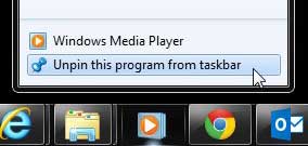 Varsayılan Windows 7 kurulumu, Internet Explorer, Windows Gezgini ve Windows Media Player dahil olmak üzere varsayılan olarak görev çubuğunda birkaç simge ile birlikte gelir.