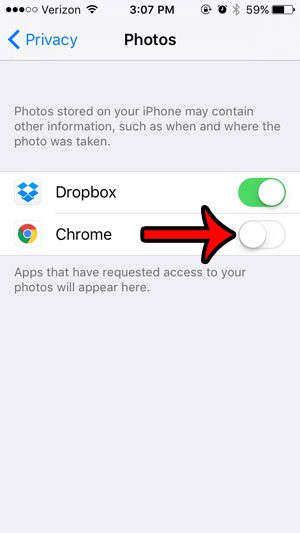 Adım 4: Fotoğraf izinlerini kaldırmak istediğiniz uygulamanın yanındaki düğmeye dokunun. Bir uygulamanın, düğmenin etrafında yeşil gölgeleme olmadığında artık fotoğraflarınıza erişimi yoktur. Aşağıdaki resimde Chrome uygulaması için izni iptal ettim.