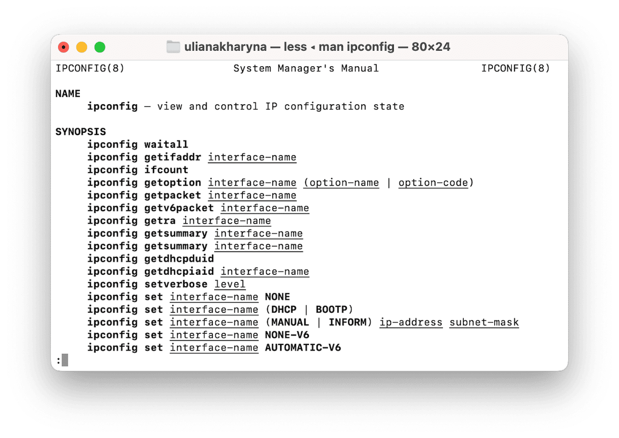 Sadece Mac Terminaline Ipconfig yazıyorsanız, 'Ipconfig'in' bir komut ve argüman izlemesi gerektiğini söyleyen bir mesaj görüntülemek dışında hiçbir şey yapmaz. Daha sonra komut örneklerini görüntüler. Başlamak için iyi bir yer, adam ipconfig ve basılı dönüşü yazmaktır. Bu, komutlar ve ne yaptıkları hakkında daha fazla açıklama yapan IPConfig için kılavuzu görüntüler.