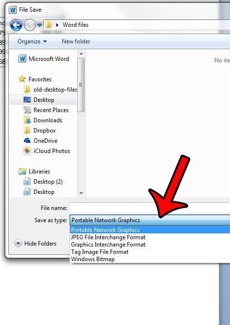 - Adım 4: Dosyayı kaydetmek istediğiniz yeri seçin, ardından sağdaki açılır menüyü tıklayınTür Olarak Kaydetve bir görüntü dosyası türü seçin. Hangi tür bir dosyaya ihtiyacınız olduğundan emin değilseniz, en güvenli seçim genellikle taşınabilir ağ grafikleri (.png) veya JPEG dosya değişim biçimidir (.jpg), çünkü diğer programlarda kolayca kullanılabilir.