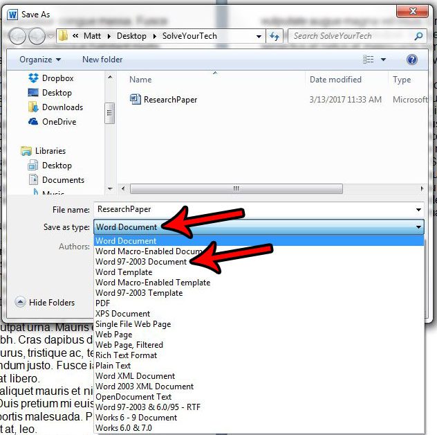4. Adım: Sağdaki açılır menüyü tıklayınTür Olarak Kaydetsonra tıklayınWord 97-2003 belgesiseçenek.