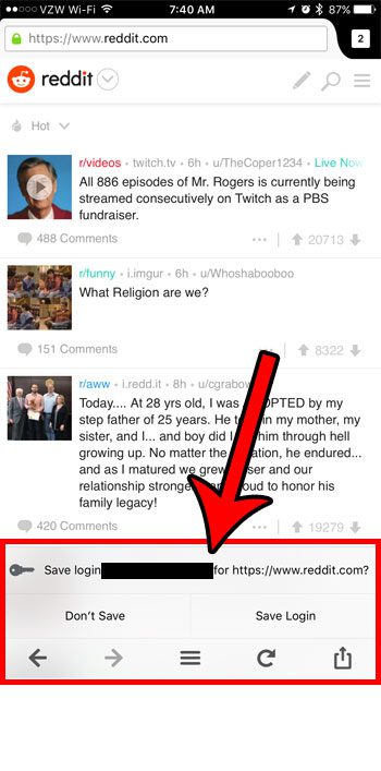 Ardından, bir web sitesi için bir kullanıcı adı ve şifre girdiğinizde ve giriş yaptığınızda, ekranın altında giriş bilgilerini kaydetmek isteyip istemediğinizi soran gri bir çubuk göreceksiniz. Bu ekranın bir örneği aşağıdaki resimde gösterilmiştir.