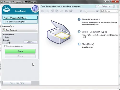 Canon Pixma MX340 ile taramak için Canon MP Navigator programını kullanmaya başlamadan önce, Canon Pixma MX340 tarayıcınızın cam tarayıcısına taramak istediğiniz öğeyi yerleştirdiğinizi onaylayın.