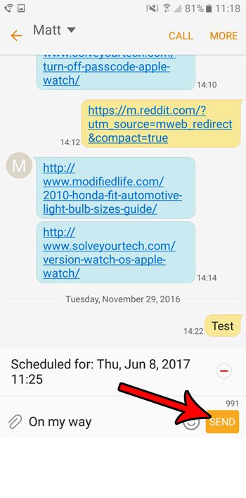 Bu yöntem, telefondaki varsayılan mesajlar uygulamasında gerçekleşir ve normal bir kısa mesaj göndermek için kullanacağınız aynı adımların çoğunu izler. Ancak, mesajın saatini ve tarihini belirleyebileceğiniz ayrı bir zamanlama mesajı seçeneği seçebilirsiniz. Android daha sonra mesajı seçtiğiniz zamanda göndermeye devam edecektir.