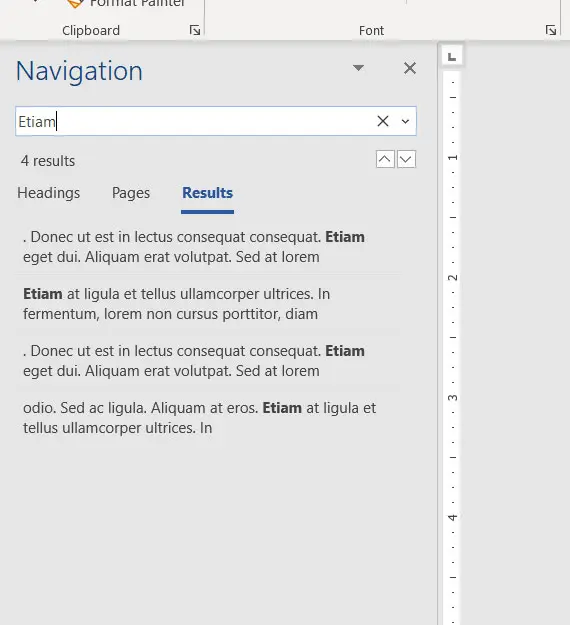 Bu daha sonra belgede görünen kelimenin her bir örneğini vurgulayacaktır ve belgenizdeki bu kelimenin oluşumuna atlamak için navigasyon sütunundaki arama sonuçlarının her birini tıklayabilirsiniz.