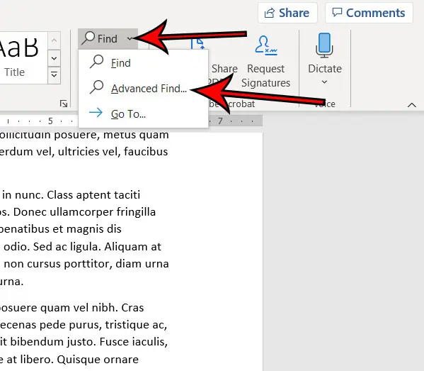 Bul düğmesinin sağındaki aşağı oklar ve bu bölümdeki diğer seçenekler için kullanabileceğiniz seç düğmesinin olduğunu unutmayın. Örneğin, birGelişmiş BulSeçenekBulmakBelgedeki belirli bir kelimeyi veya kelimeleri bulmak için ek arama seçenekleri için kullanabileceğiniz açılır menü.