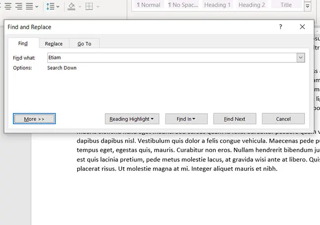 - Bulun ve Değiştir iletişim kutusu göründüğünde ve bunu kelime belgeleri aracılığıyla aramak için kullanmaya başladığınızda, tüm bir belgede arama yapmanın ve kelimenin değiştirdiğini özelleştirmenin daha iyi bir yolu olduğunu bulmanız mümkündür. Neyse ki bu, diğer Microsoft Office uygulamalarında var olan benzer bir arama işlevidir, böylece bunu kullanabilirsiniz ve elektronik tablolara ve slayt gösterilerine bakarken arama için gelişmiş seçenekleri.