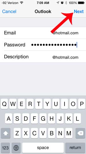 Adım 5: Hotmail adresinizi ve şifrenizi ilgili alanlarına yazın. Açıklama alanı otomatik olarak kendini dolduracaktır. DokunmakSonrakiBitirdiğinizde düğme.