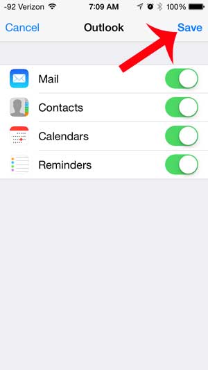 Adım 6: Hotmail hesabınızdan iPhone'unuzla senkronize etmek istediğiniz bilgileri seçin, ardındanKaydetmekekranın sağ üst kısmındaki düğme.