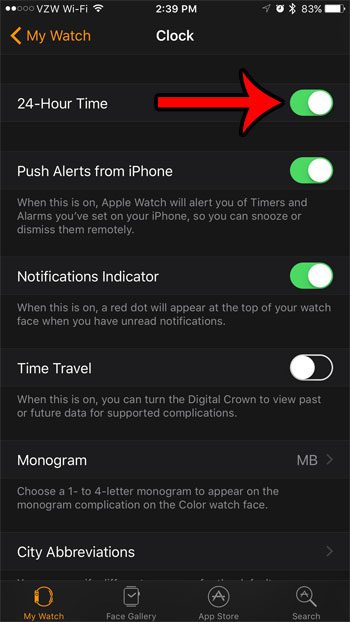 Aşağıdaki öğreticimiz, bağlı iPhone'unuzdaki saat uygulamasında bulabileceğiniz bir seçeneği ayarlayarak OT'nin 24 saatlik zaman ayarını nasıl kullandığını gösterecektir.