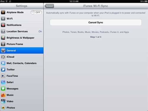 DokunAyarlariPad'inizin ana ekranında simge,GenelEkranın sol tarafında seçenek, ardından dokununiTunes wi-fi senkronizasyonuekranın ortasında.