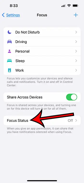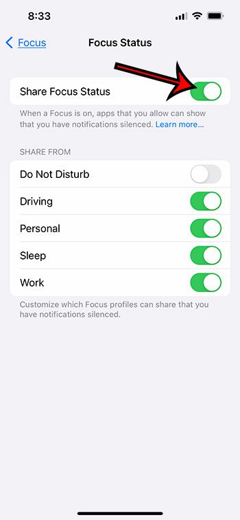 Odak durumunu bir iPhone 13'te paylaşabilirsiniz.Ayarlar> Odaklama> Odak Durumu>Ve açılıyorPaylaşım Durumunu Paylaşın.
