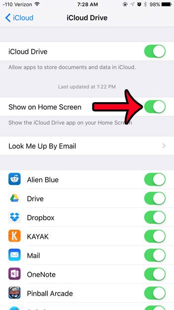 Uygulama simgesi, düğmenin etrafında yeşil gölgeleme olduğunda görüntülenir. Örneğin, aşağıdaki resimde iCloud Drive uygulaması seçeneğini etkinleştirdim.