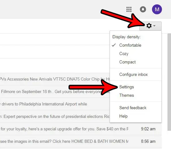 2. Adım: Gelen kutusunun sağ üst kısmındaki dişli simgesini tıklayın, ardındanAyarlarseçenek.